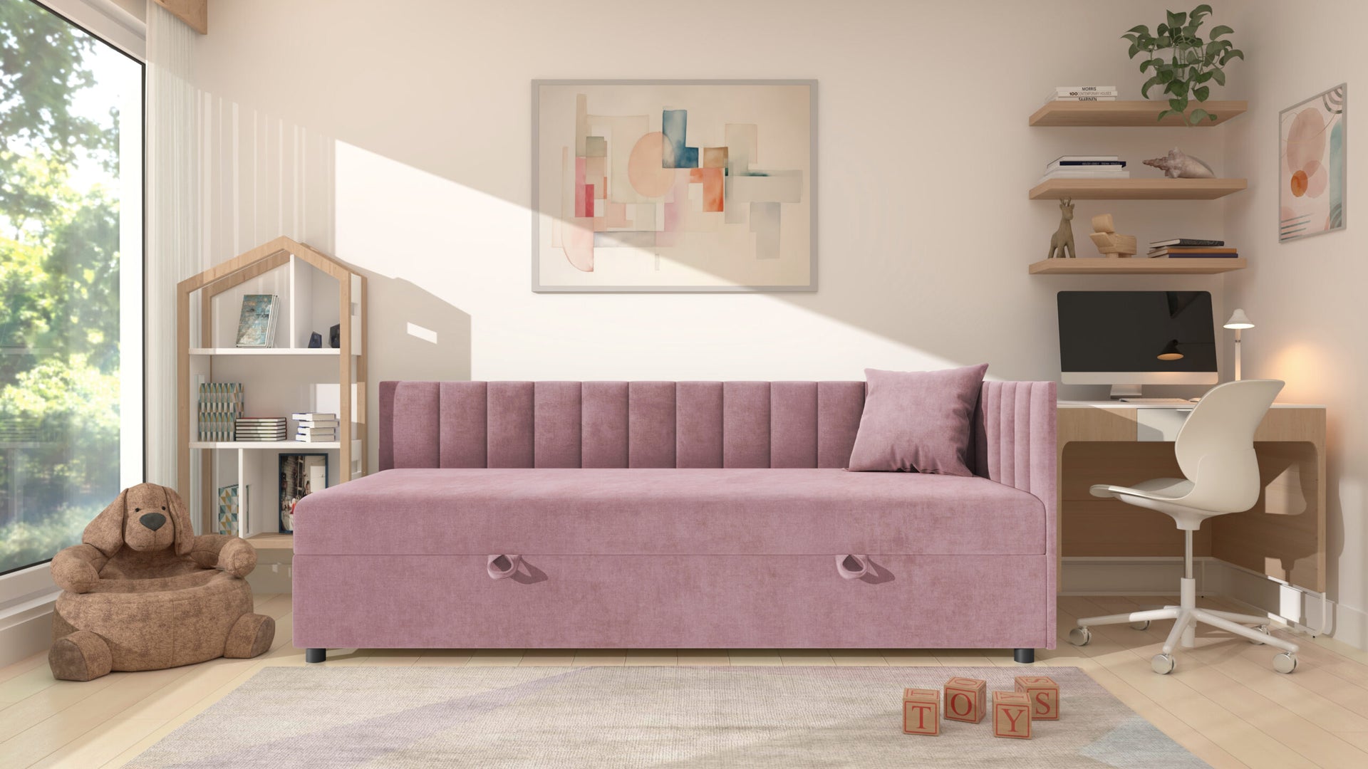 Dysponujesz małą ilością miejsca, ale zależy Ci na wygodnym łóżku do codziennego spania? Ten tapczan to praktyczne rozwiązanie do pomieszczeń o mniejszym metrażu – świetnie sprawdzi się w kawalerce, pokoju młodzieżowym, gościnnym czy w mieszkaniu na wynajem. Dzięki kompaktowym wymiarom i prostej, lekkiej formie idealnie wpasuje się w niewielką przestrzeń, nie obciążając jej wizualnie.To model, który łączy w sobie to, co najważniejsze: komfort spania, solidną konstrukcję i miejsce do przechowywania. Duży pojemnik zapewni Ci dodatkową przestrzeń, której często brakuje w małych wnętrzach – schowasz w nim pościel, koce, poduszki czy sezonowe tekstylia. Łóżko tapczan dla dziecka Tutuś dostępne jest w wtielu wymiarach - szerokość od 70 do 120 cm, a długość od 180 do 200 cm.
