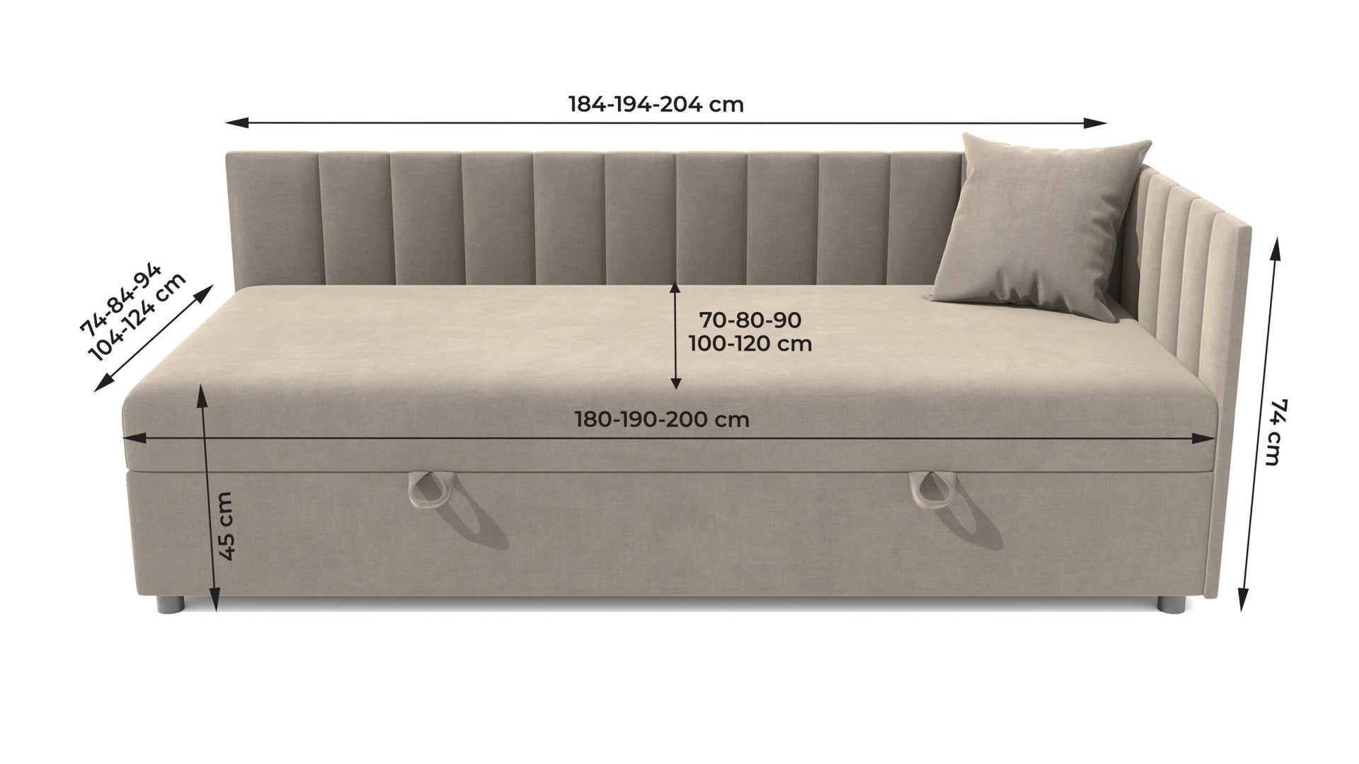 Strona mniejszego boczka jest uniwersalna, co ułatwia dopasowanie tapczanu do ustawienia w pomieszczeniu. Przed planowanym dostarczeniem otrzymają Państwo informację o wyznaczonym terminie dostawy.